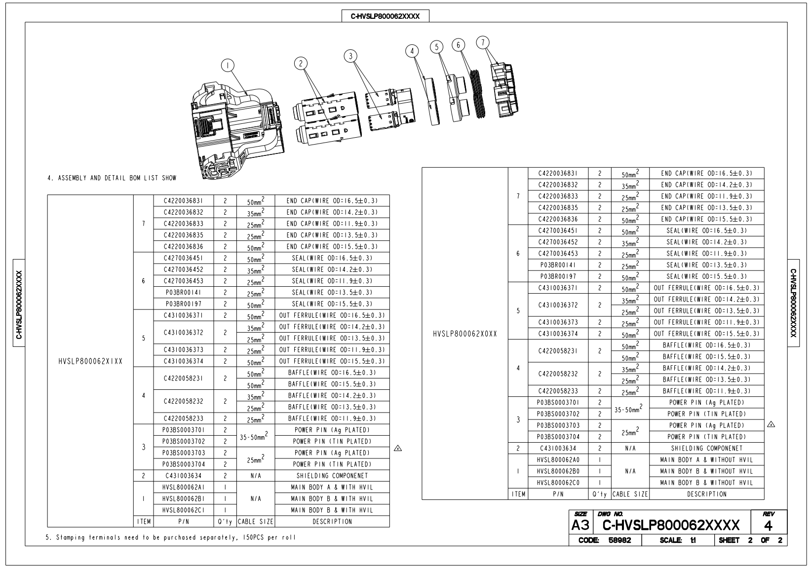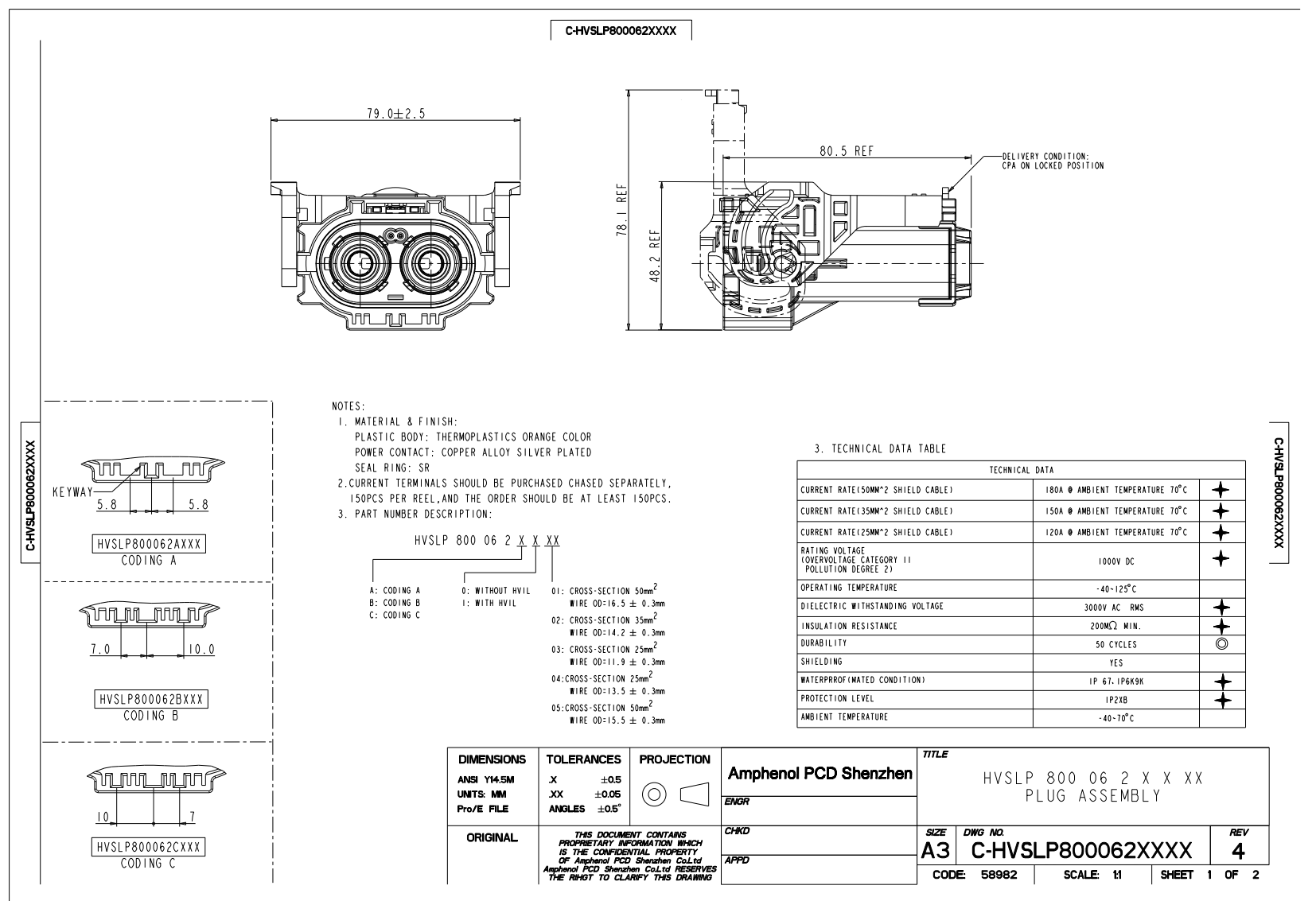 插头, 2 芯, 200A MAX, 防误插位置 A/B/C , 带 / 不带高压互锁HVIL, 25 /35/ 50 mm2 线缆额定电流: 120A@25 MM2 CABLE 150A@35 MM2 CABLE 200A@50 MM2 CABLEP/N SAMPLE: HVSLP800062A101HOW TO ORDER: