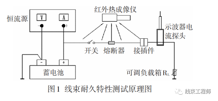 传统的耐久特性测试中使用的是温度传感器来测量导线温度,这种方法只能反映导线某个测量点的温度,并不能反映整个导线的温度。因此本文中提出了使用红外热成像仪测量导线温度的方法,该方法能直观快速地从整体观测被测线束的温度。图1为改进的线束耐久特性测试原理图。过载电流的计算公式为: