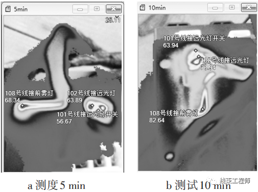 1)传统的耐久特性测试使用温度传感器记录线束温度,该方法只能测量导线某个点的温度;本文中提出的使用热成像仪测量导线温度,可以动态直观的观察包括接插件、导线、电器设备在内的整个线束系统的温度,并且可以快速找到最高温度点从而分析线束的耐久特性;