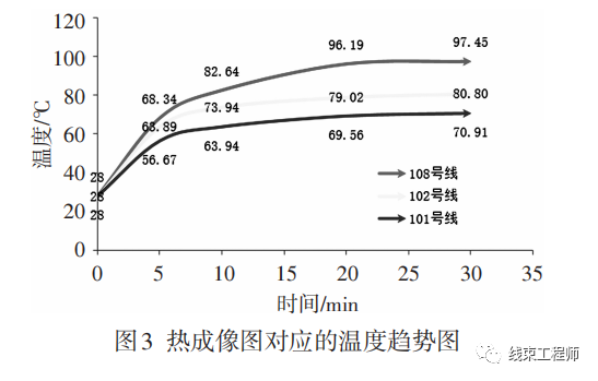 本次试验中101、102、108导线的参数见表1。根据表1中的数据计算得出101、102、108导线 I2R值 分 别 为 22.7、293.6、317.3,即 导 线 发 热 量Q108>Q102>Q101 , 从 而 得 出 导 线 温 度T108>T102>T101 ,与热成像仪测量出的导线温度趋势(图3)符合。
