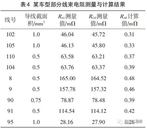 表4是某车型部分导线测量结果,可以看出所有导线压接点接触电阻 RAB 均小于表3中值,即导线与端子触点压降符合标准QC/T29106-2014的要求,测试结果表明线束触点压降符合要求,该方法能有效地进行触点压降测试。